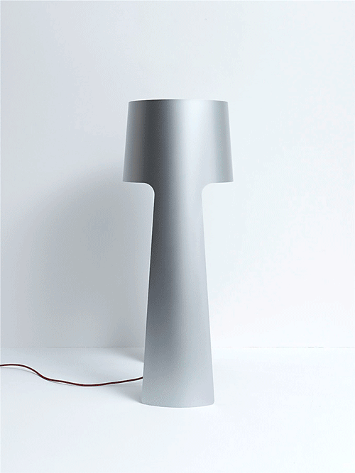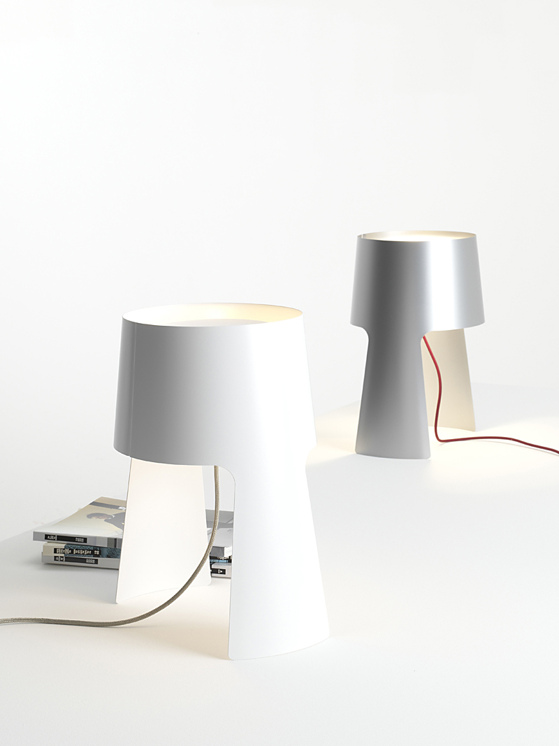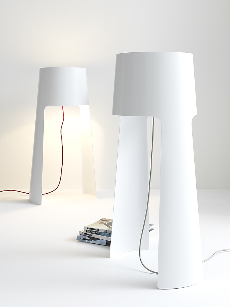 Coen is playing with the appearance of an archetypal luminaire. The consequent simplicity, in its appearance and design is mirrored in the clear silhouette. The simple composition is possible through the handling of one steel sheet. The ends are closing the corpus and at the same time forming the absorption of the illuminant. The main pillar and lampshade are directly merged and hence create its distinctive play of light and shadow, which is reminiscent of butterfly wings. The Coen lamps are available in white and silver as well as floor land table lamps (height 105 and 45cm). They are delivered with energy-saving halogen bulbs, dimmer and textile cord.