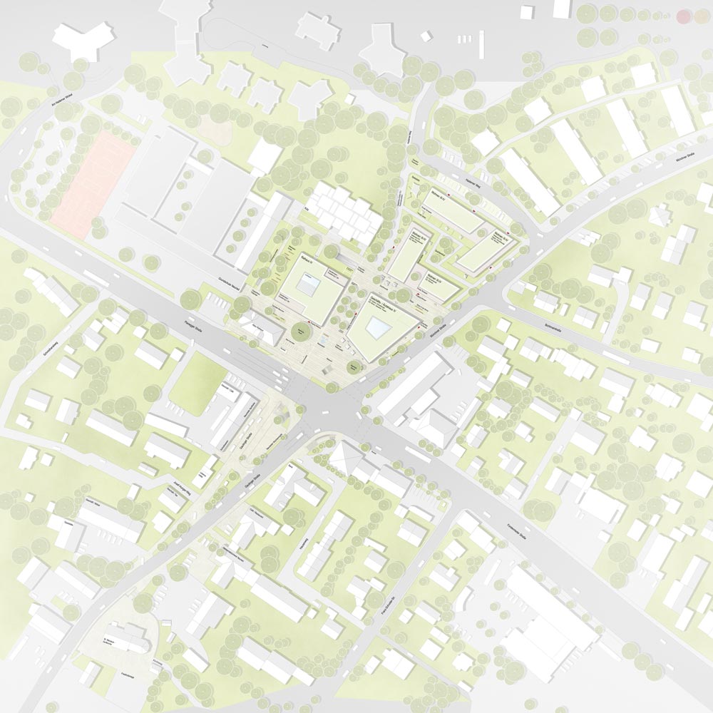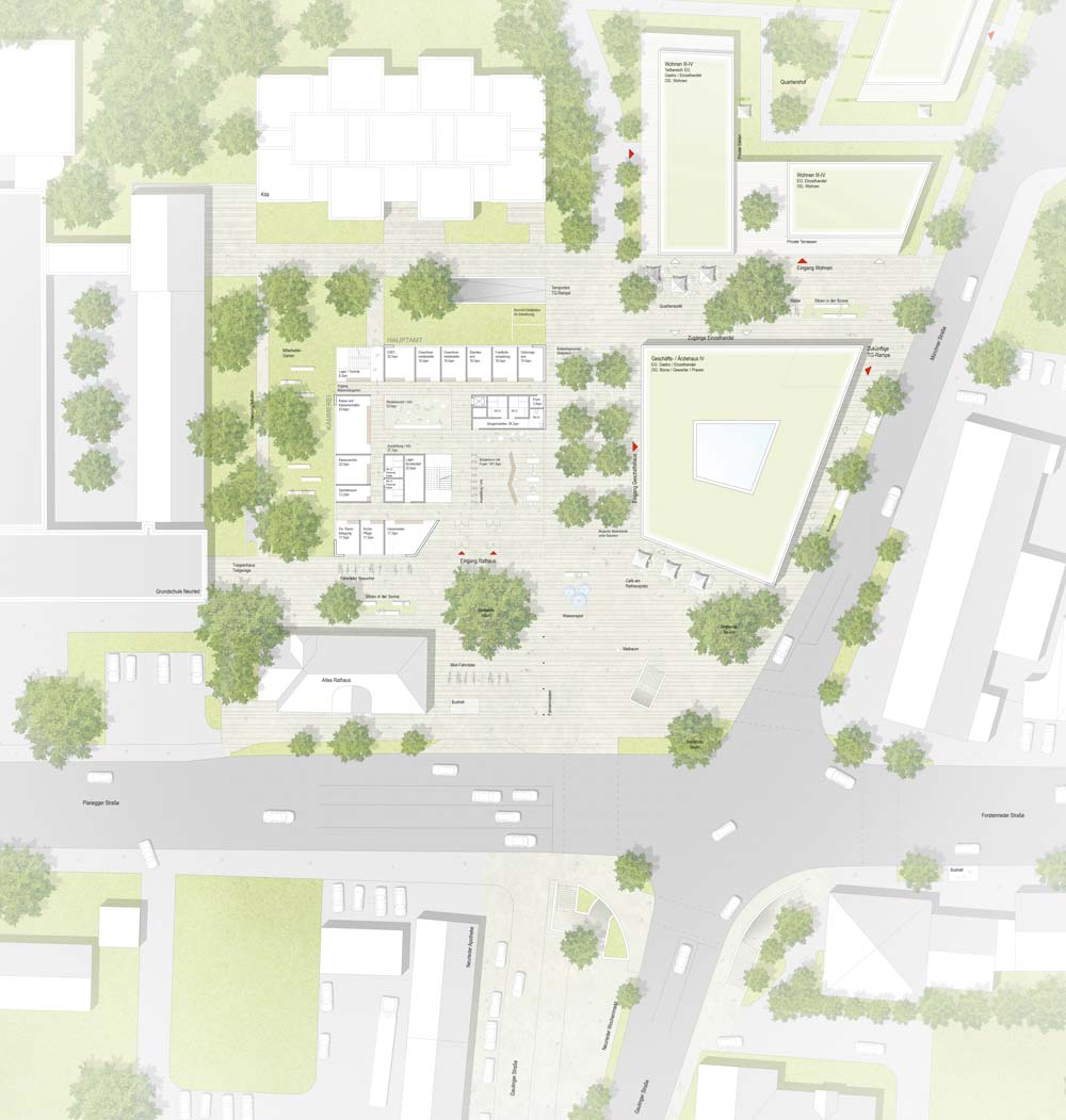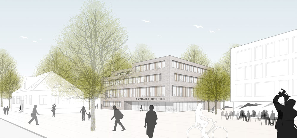 NEURIED NEUGESTALTUNG ORTSMITTE NEURIED MIT NEUBAU DES RATHAUSES Nichtoffener Realisierungswettbewerb mit Ideenteil – 1. PreisArchitektur-Illustration von Lageplan, Grundriss und Ansichten.3D-Modeling des Baukörpers für den Entwurfsprozess und Ausarbeitung als Vorlage des Architekturmodellbaus. KundeAckermann + Renner Architekten GmbH, Berlin ModellbauMMB Modellbau Milde Berlin
